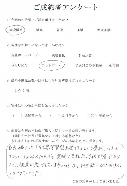 この度は、数ある不動産会社の中からハウスコンシェルジュ日の出殖産にてご成約頂きましてありがとうございました。 M様の夢のお手伝いができて大変光栄です。 夢の実現おめでとうございます(^^)/ 引き渡し後も相談等ございましたら、お気軽にお問い合わせください。